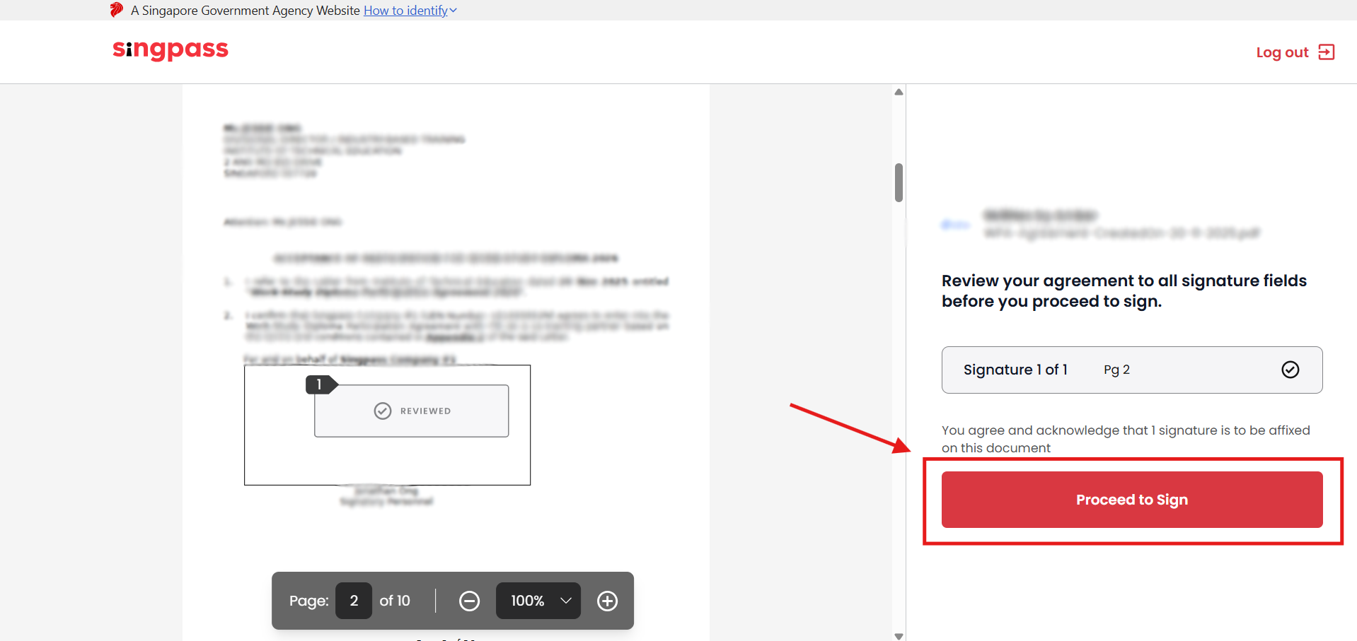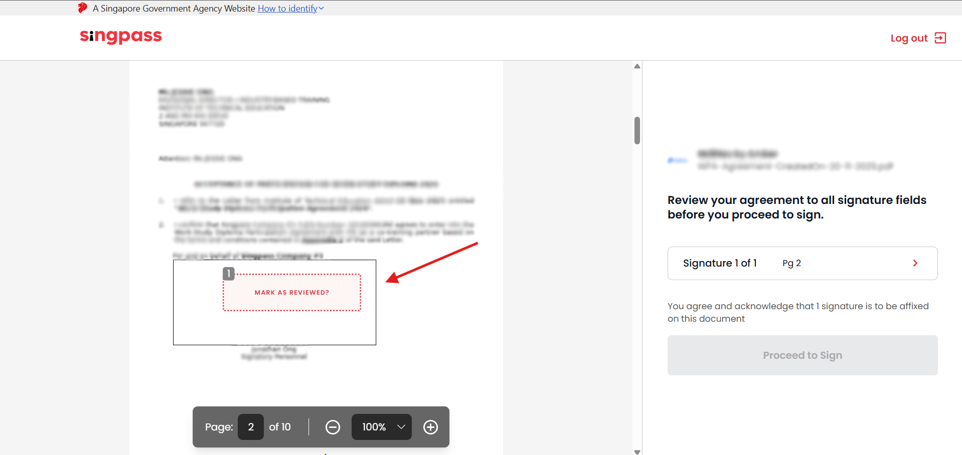 After logging in with Singpass, you will see a red box in the document that need to be signed.