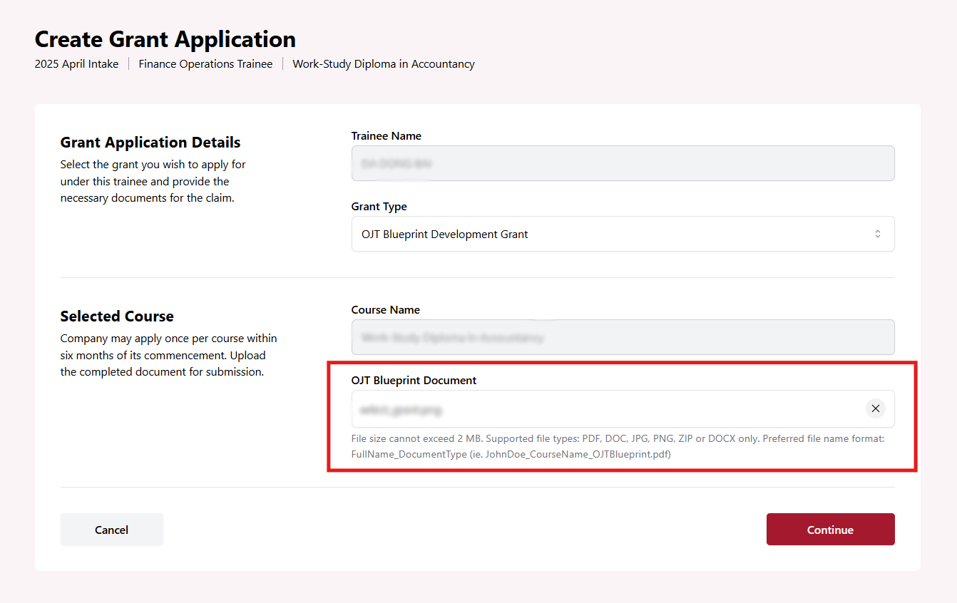 Upload OJT Blueprint Document in the form field.