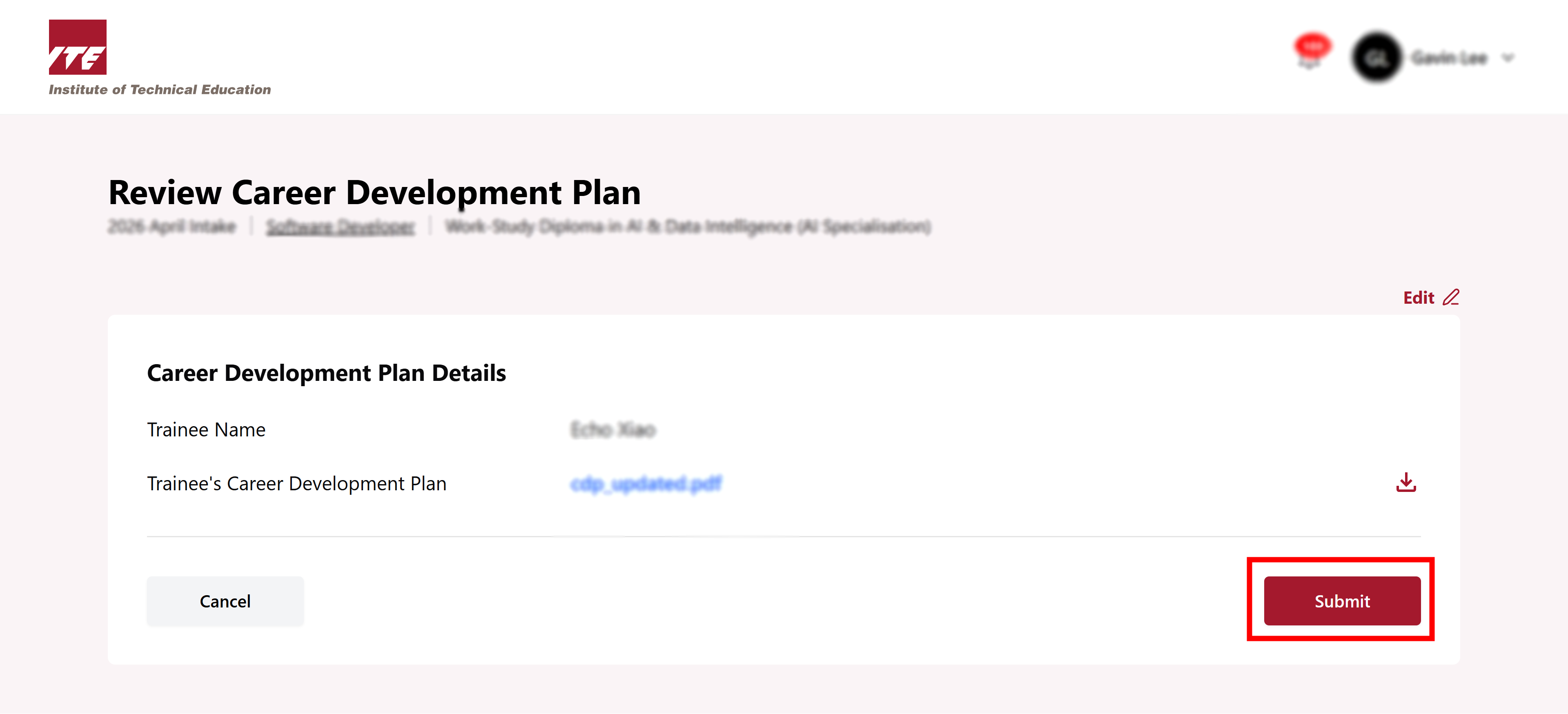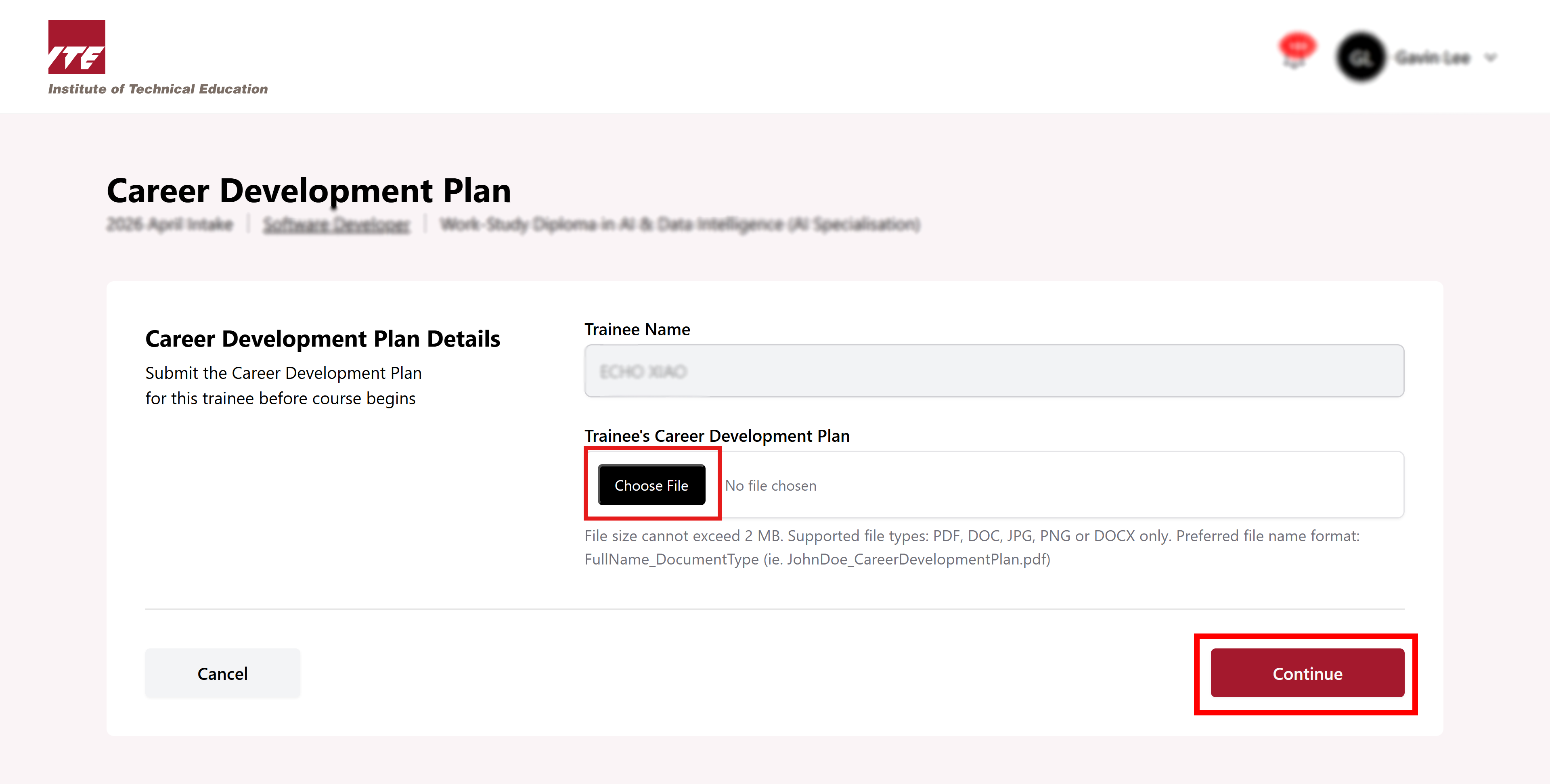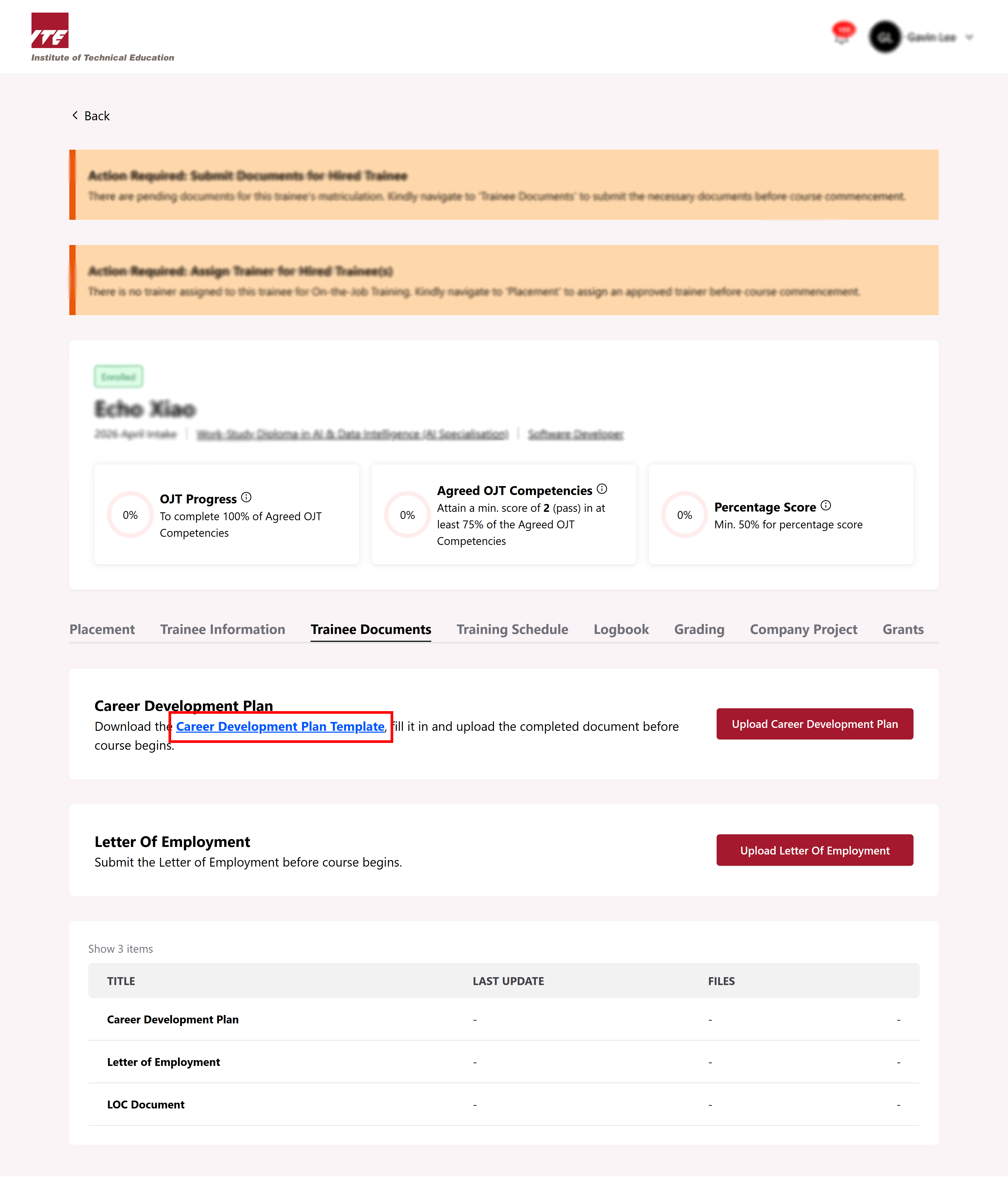 Company Rep is required to upload the Career Development Plan (CDP) for each individual trainee before the start of the course.